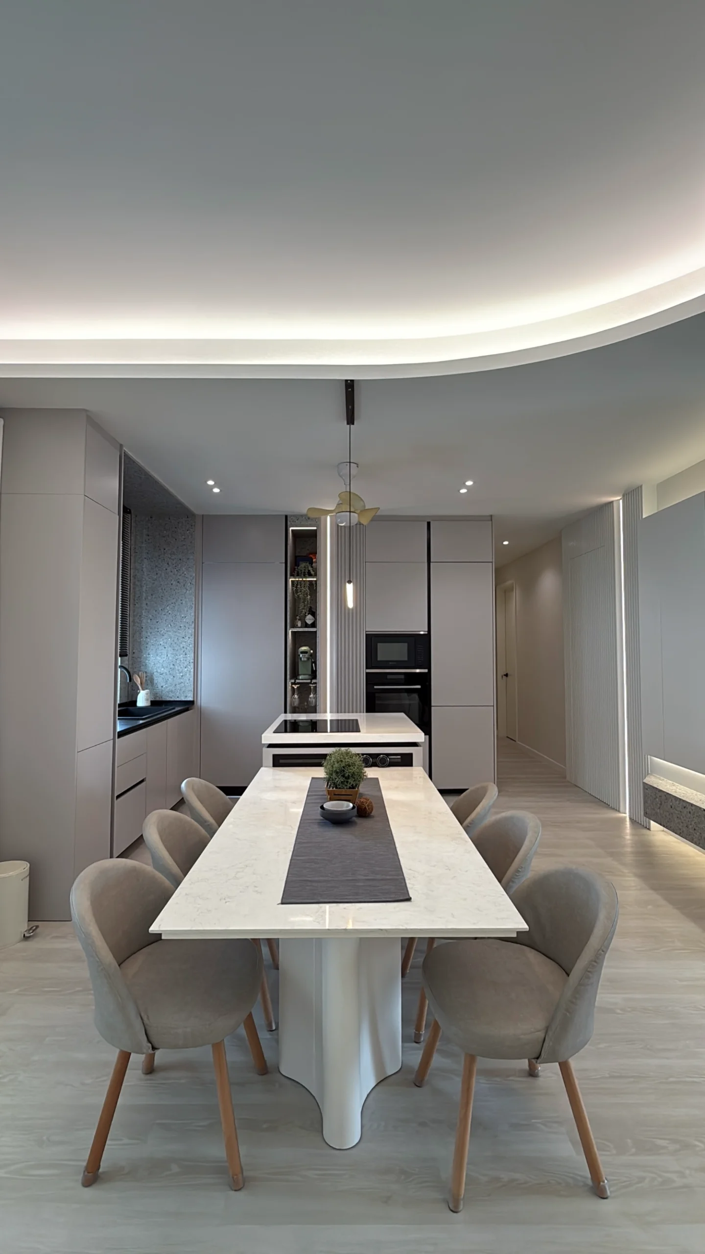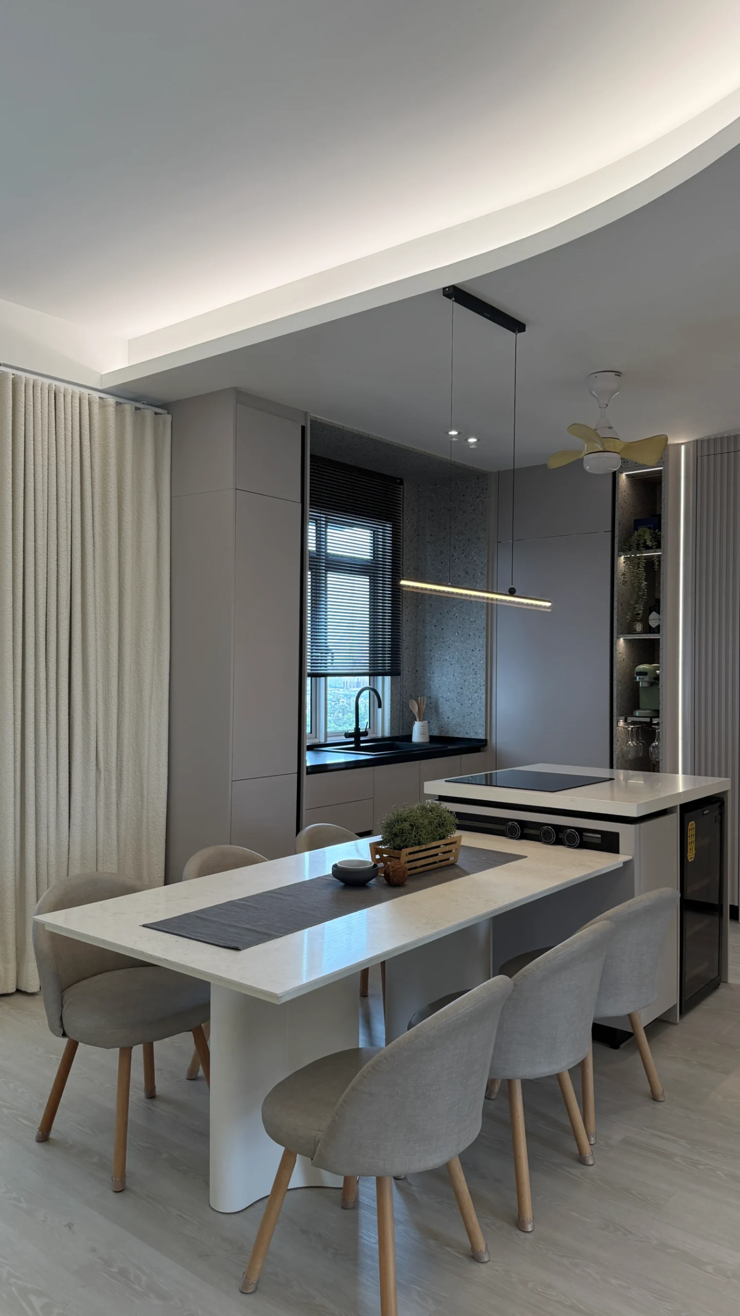 Discover a touch of modern sophistication in this office with the sleek, white-themed pantry, featuring a central island for added utility and style. This smartly designed space effortlessly combines function and aesthetics, providing staff with a chic area to gather, collaborate, or enjoy a peaceful break.